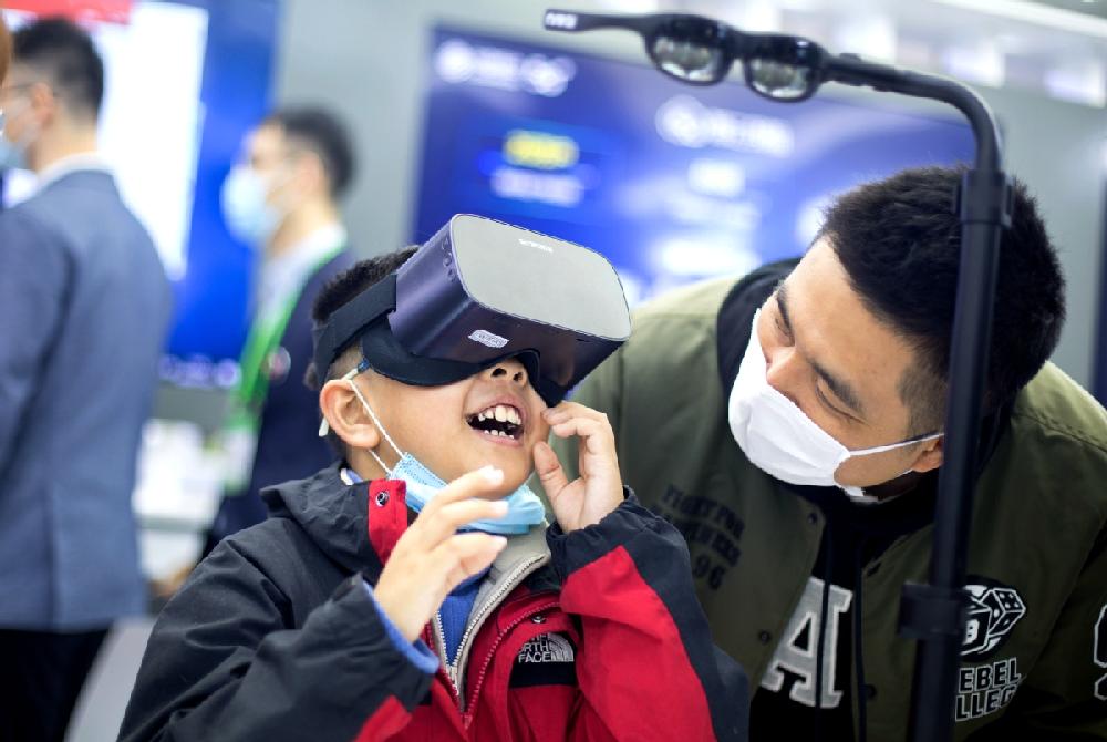 A child watches cloud video footage using virtual reality technology at the Light of Internet Expo, part of the World Internet Conference-Internet Development Forum, in Wuzhen, Zhejiang province, on Sunday.