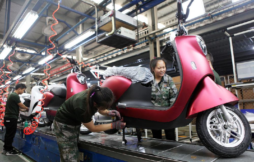 Workers assemble electric scooters at a Yadea Group factory in Chongqing in June 2020. [Photo by Chen Shichuan/For China Daily]