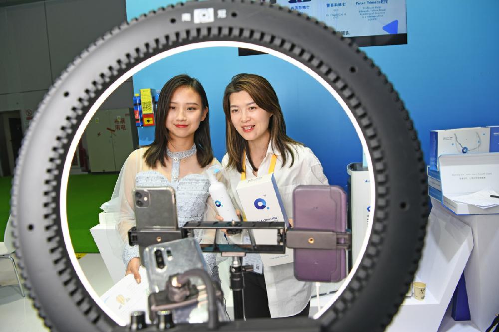 Employees of a UK-based company promote air purifiers via livestreaming platforms during the third China International Import Expo in Shanghai in November. CHEN BIN/FOR CHINA DAILY