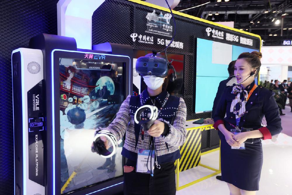 A visitor experiences China Telecom's services using VR devices during an expo in Beijing. [Photo/CHINA DAILY]