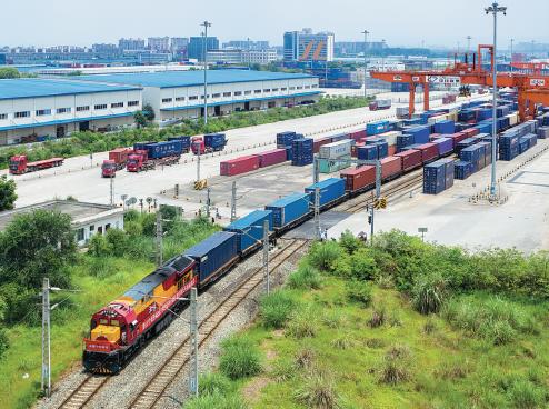 A China-Europe (Chengdu) Railway Express freight train carrying 50 containers of goods departs from Chengdu International Railway Port to Poland in July. BAI GUIBIN/ FOR CHINA DAILY
