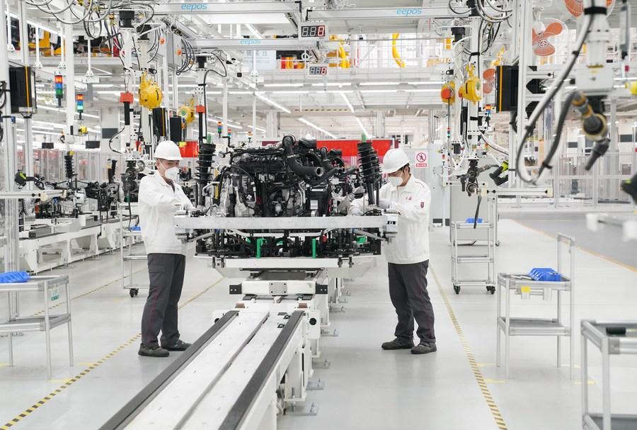 People work at the assembly line of China's leading automaker FAW Group Co., Ltd. based in Changchun, capital of northeast China's Jilin Province, April 22, 2022. (Xinhua)