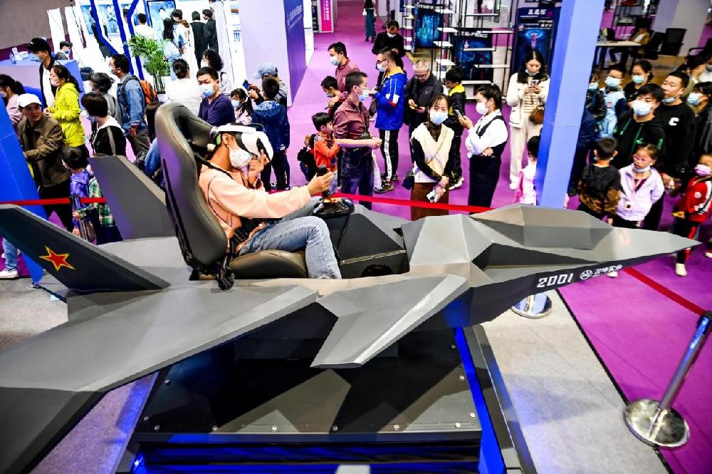 A child "pilots" a plane via a VR program at the 2022 World Conference on VR Industry in Nanchang, east China’s Jiangxi province, Nov. 13, 2022. (People's Daily Online/Bao Gansheng)