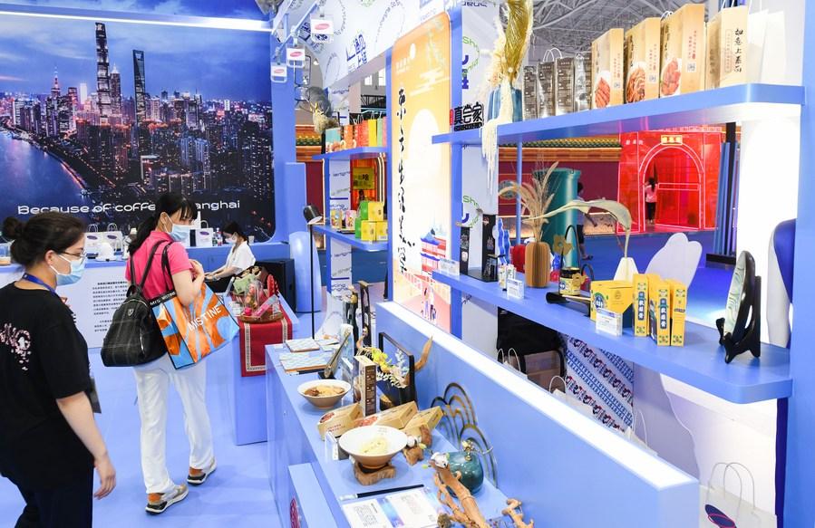 Visitors view exhibits at the booth of Zhenchangjia, a brand of Yuyuan Inc., at the second China International Consumer Products Expo (CICPE) in Haikou, south China's Hainan Province, July 26, 2022. A batch of domestic brands have attracted a lot of visitors at the expo. (Xinhua/Yang Guanyu)