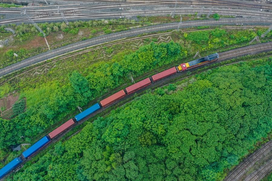 Aerial photo taken on May 21, 2022 shows a China-Laos cargo train departing from a station in southwest China's Chongqing Municipality. (Xinhua/Tang Yi)