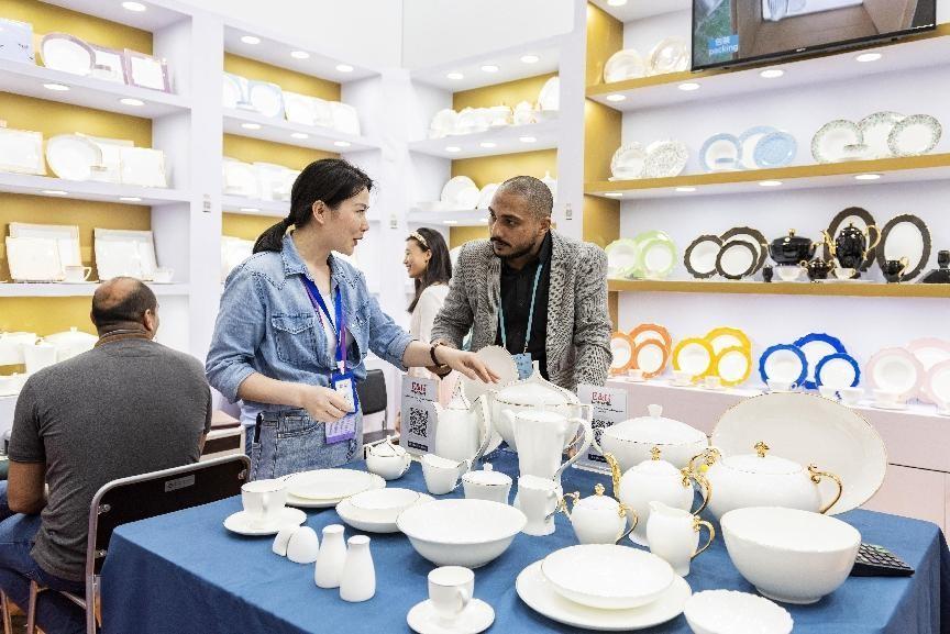 Foreign merchants negotiate with staff members of a Chinese porcelain manufacturer at the 133rd China Import and Export Fair, also known as the Canton Fair, held in Guangzhou, south China's Guangdong province, April 23, 2023. (People's Daily Online/Xu Huasen)