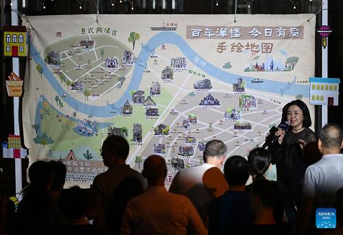 A staff member introduces the map that shows the location of western-style buildings at the opening ceremony of the 5th Tianjin Nighttime Life Festival in north China's Tianjin Municipality, Aug. 2, 2024. The 5th Tianjin Nighttime Life Festival began here on Friday night and will last about one month. People can enjoy night markets, music shows, sports games and art exhibitions during the festival.