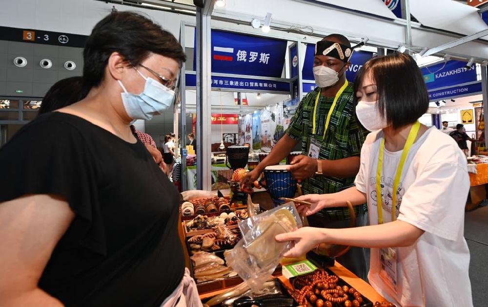 8月14日,参观者在西安国际会展中心国际馆加纳展位上了解当地特色产品。 新华社记者 李一博 摄