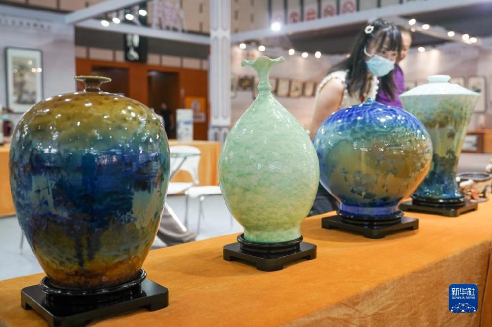 8月18日,观众在第二届中国工艺美术博览会参观特色陶瓷艺术展品。