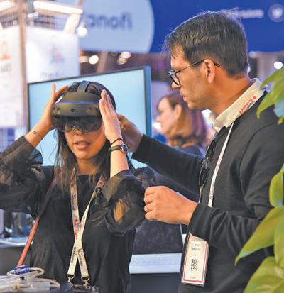 2022年6月,法国科技创新展览会上,观众在体验虚拟现实技术产品。