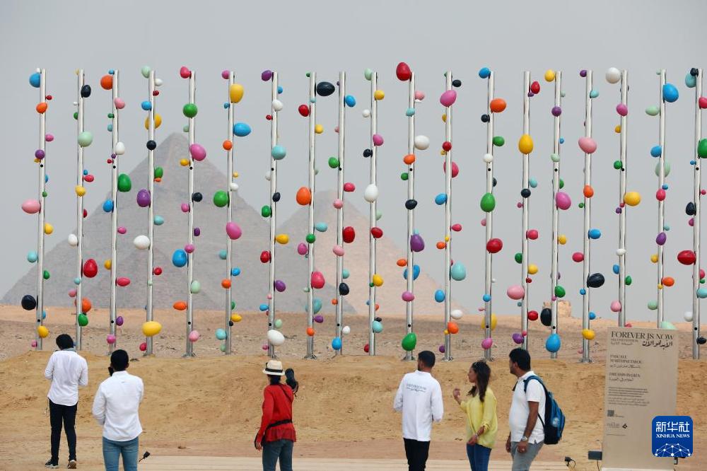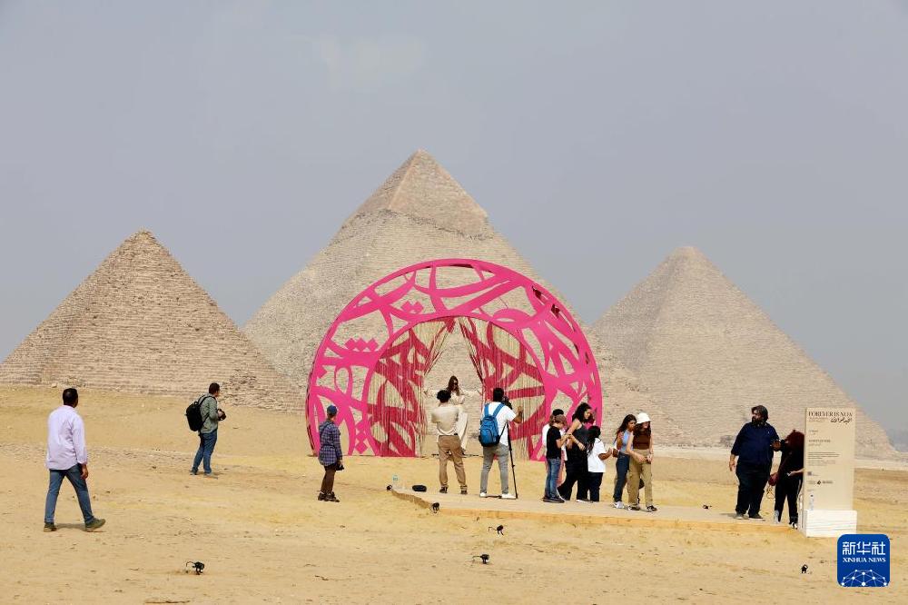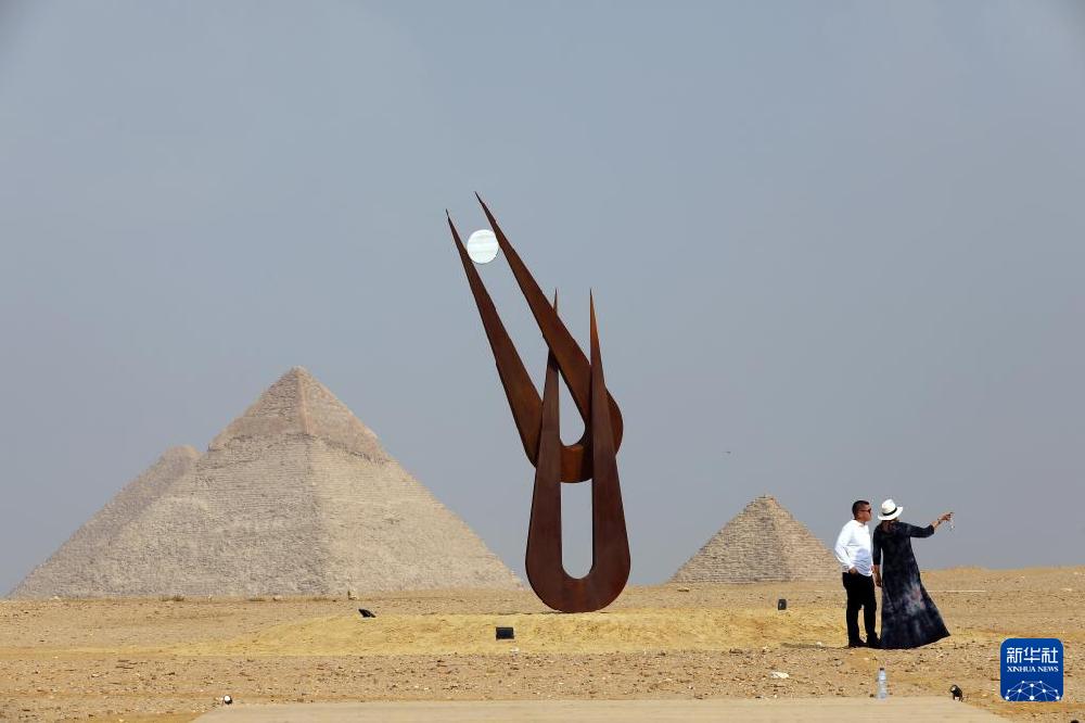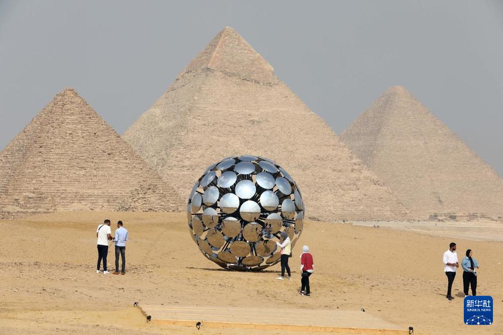 10月27日,人们在埃及吉萨金字塔景区参观艺术作品。新华社发(艾哈迈德·戈马摄)