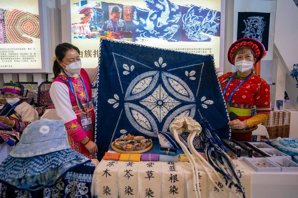 11月20日,扎染技艺传承人在南博会旅游文化馆内展示扎染作品。新华社记者 陈欣波 摄