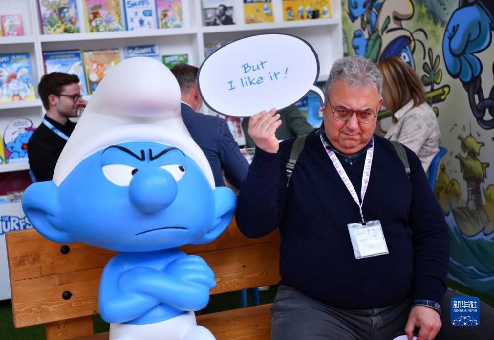 3月7日,参观者在意大利博洛尼亚国际儿童书展上与卡通玩偶合影。第60届博洛尼亚国际儿童书展于3月6日至9日在意大利博洛尼亚会展中心举办。该书展创始于1964年,是世界少儿图书和多媒体行业最重要的展会之一。新华社记者 金马梦妮 摄