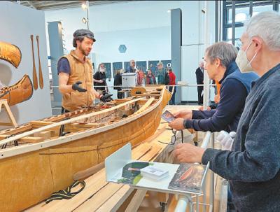 在德国慕尼黑国际手工业博览会上,参观者在了解手工制作木船的工艺。
