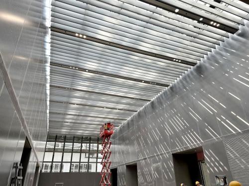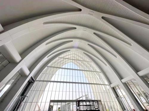 5天完成1.4万平方米墙地面石材下单;8天完成9953盏调光灯的安装及调试;15天完成南立面2000平方米超大宽度拉杆玻璃幕墙施工;16天完成会议厅2200平方米超长大倾角铝镁锰屋面系统施工;18天完成登录厅11000平方米的铝板安装;20天完成南北立面超大跨度双曲独立柱铝板安装。高效建造,品质履约,下面让我们一起回顾建设过程中的精彩瞬间。