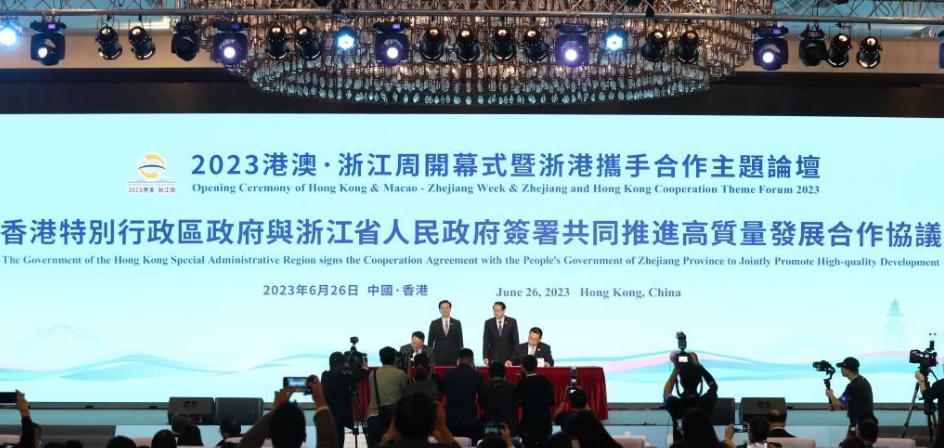 2023港澳·浙江周开幕式暨浙港携手合作主题论坛26日在香港举行。浙港双方现场签署共同推进高质量发展合作协议以及3项合作备忘录,同时签约多个合作项目,涉及高端制造、信息技术、教育科技等领域。