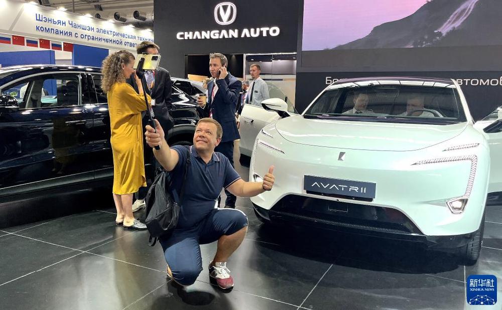 7月11日,在俄罗斯叶卡捷琳堡举办的第七届中俄博览会上,参观者与中方企业展出的汽车合影。