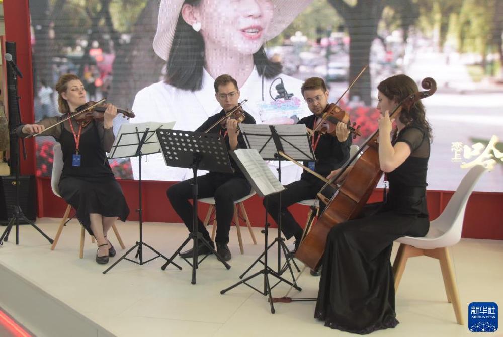 7月11日,在俄罗斯叶卡捷琳堡举办的第七届中俄博览会上,演出人员演奏《莫斯科郊外的晚上》。