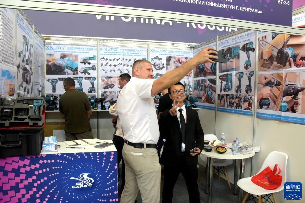7月11日,在俄罗斯叶卡捷琳堡举办的第七届中俄博览会上,参观者与中方参展代表合影留念。