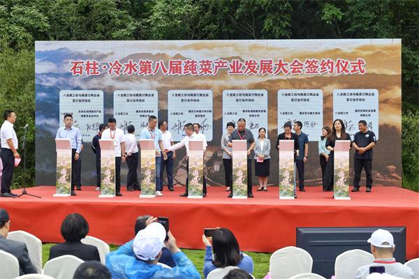 冷水镇作为中国莼菜农业公园的核心产区,依托独特的资源禀赋、文化底蕴、区位交通,充分发挥村集体经济组织带动作用。在今天的大会上,石柱县八龙莼工坊农业发展有限公司签订了总金额1056万元的莼菜订单,其中包含了699.5万日元(折合人民币36万元)的外贸订单。这不仅壮大了村集体组织经济,更实现了石柱县村集体经济组织外贸出口零的突破。
