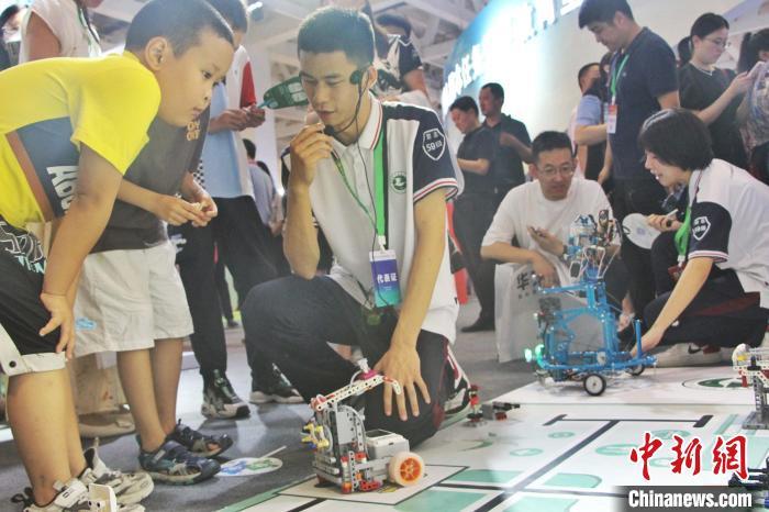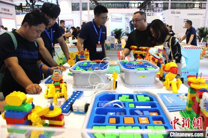 山东省教博会现场展出的智能积木吸引观众驻足咨询。
