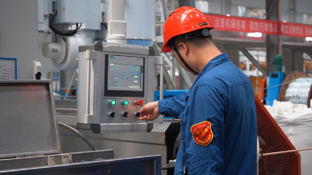 华菱线缆生产车间内工人正在操作机器。苏李摄