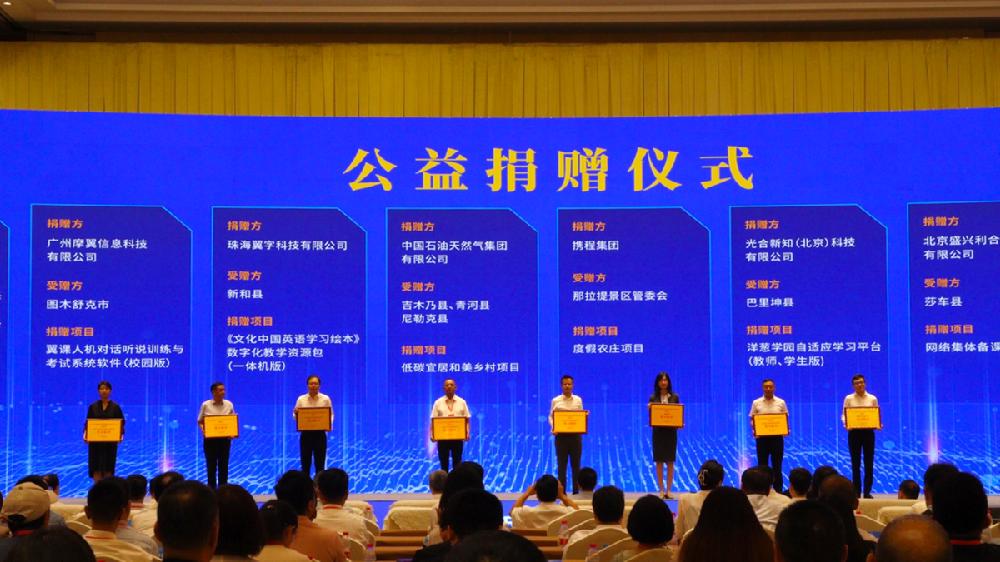 大会上,珠海翼字科技有限公司、广州市动景计算机科技有限公司等10家爱心企业向新疆喀什地区莎车县、兵团第三师图木舒克市等15个县(市)捐赠了价值3100多万元的产品,包含数字化助力乡村振兴、互联网+教育、智慧旅游等23个项目。