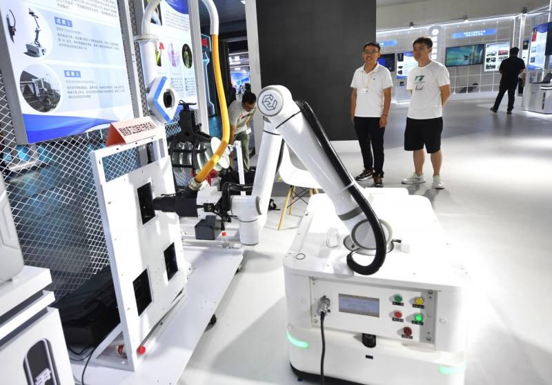7月27日,北京市总工会展区智能多工位自动充电机器人。