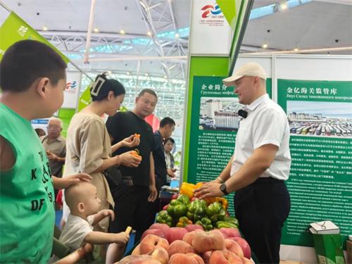 “伊犁的桃子竟然比我的手掌还大,真是大饱眼福?!崩醋陨挛鞯目蜕萄钭谌ù笫苷鸷??;舳菇鹨诠拭骋祝牛┯邢薰镜钠咸选⑵还?、油桃果香四溢,吸引了大量客商驻足,茄子、番茄、彩椒同样引人注目。