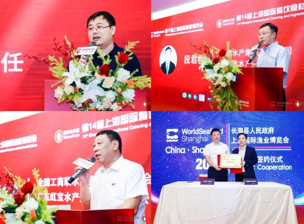 中华全国工商业联合会水产业商会常务会长田全海、中国远洋渔业协会会长张显良、深圳市水产行业协会会长陈沛忠、中国渔业协会水产商贸分会执行会长葛锦海、上海市餐饮烹饪行业协会秘书长沈一峰、上海市食品协会主任施伟俊、中国农业发展集团有限公司副总经理刘辉、深圳港集团副总经理王彦、上海水产集团有限公司&上海市水产行业协会段君恒等行业商协会及公司代表,澳大利亚驻沪办事处、南澳大利亚州政府中国区、塔斯马尼亚州政府驻华办公室、加拿大驻北京大使馆、加拿大驻上海总领馆、魁北克政府驻上海办事处、加拿大不列颠哥伦比亚省中国办公室、斯里兰卡驻上海总领馆、印尼驻上海总领事馆贸易促进中心、印尼海洋渔业部、厄瓜多尔驻北京大使馆、英国驻北京大使馆、阿根廷驻上海总领馆等驻沪领馆代表,上海市政协委员阮青、大连市市政府副市长刘东立、河北省农业农村厅党组副书记、一级巡视员吴更雨、长海县人民政府县长刘宝庆、深圳市规划和自然资源局渔业管理处副处长李江萍、等行业主管部门以及上海艾歌展览服务有限公司执行董事韩友恒等重要来宾出席活动。