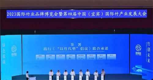为深入贯彻习近平生态文明思想、积极践行《“以竹代塑”倡议》,推进竹产业绿色、低碳、创新发展,开幕式上,重庆市忠县,云南昭通市,贵州遵义市,四川乐山市、眉山市、达州市、雅安市、宜宾市共同签署了践行《“以竹代塑”倡议》联合承诺,内容涉及加强公共宣传、拓展社会认知,制定利好政策、推动产业发展,鼓励科技创新、满足消费需求,带头应用示范、引导社会参与四大方面。