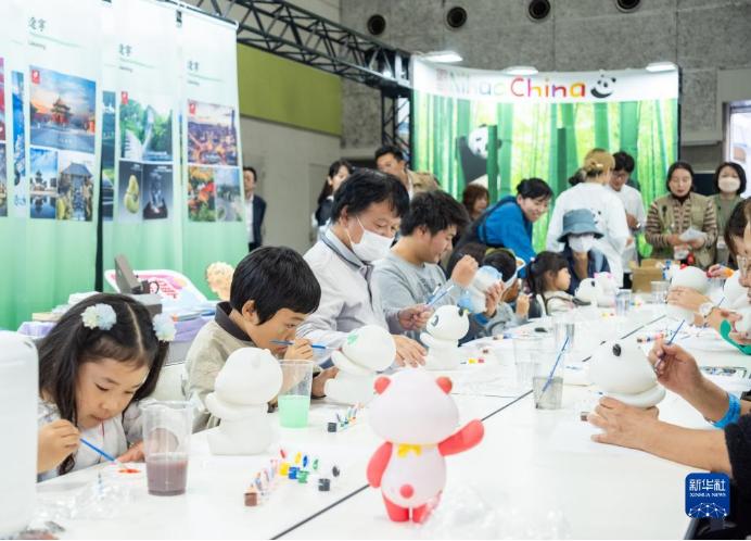 10月28日,游客在日本大阪国际会展中心中国馆体验为熊猫玩偶上色。新华社发(中国驻大阪旅游办事处供图)