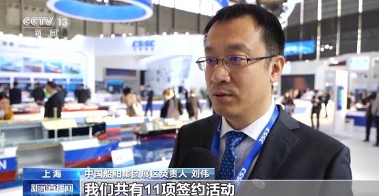 中国船舶集团展区负责人 刘伟:我们共有11项签约活动,40余项新产品的发布推介。参展的展品包括造船业皇冠上的三颗明珠,航空母舰、大型液化天然气船和首艘国产大型邮轮等共300件模型实物和沙盘参展,以三维动画和VR等科技手段来展现我们最有代表性的高质量发展成果。
