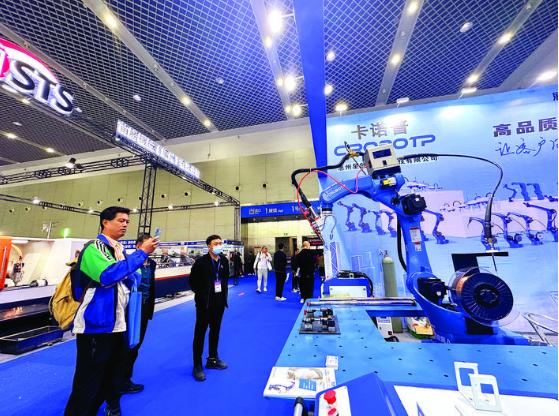 在惠州会展中心主会场,展出的机器人自动切割装备吸引了不少人关注。 惠州日报记者谭琳 龚妍 摄