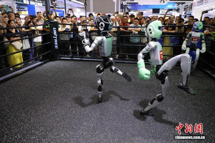 在智能机器人展区,宇树科技的人形机器人上演一场场令人惊叹的拳击赛。它们拳来脚往,倒地后能自主站立起身,动作干净利落,引来观众阵阵惊呼。此次展会上的机器人技术更趋“具身化”与智能化,不仅可模拟人的步态、舞蹈动作,还能结合沟通对象的手势和实时场景进行交互,实现从以往的单机运行向主动多机协同交互的跨越。
