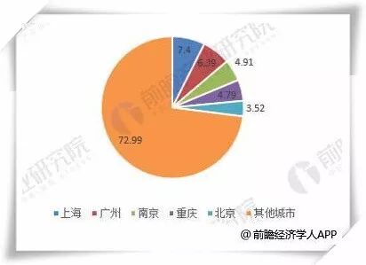 2017年上海、广州、南京、重庆和北京全年办展数量全国占比(单位:%)