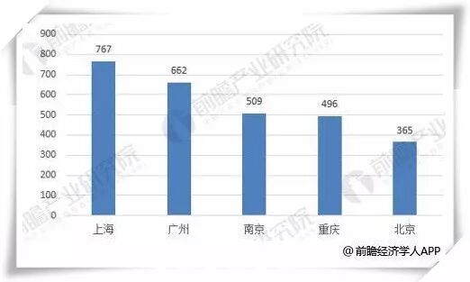 2017年上海、广州、南京、重庆和北京全年办展数量(单位:场)