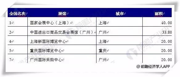 国家会展中心(上海)以40万平方米的室内展览面积霸占全国十大室内展览面积展馆榜首;广州的中国进出口商品交易会展馆(广州)位列全国第二,室内展览面积为33.8万平方米;重庆国际博览中心以20万平方米的室内展览面积位列全国第五。