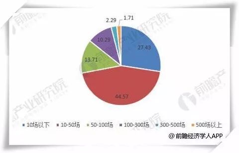 2017年,在提供统计数据的175个展览城市中,举办展览在500场以上的有3个,在300-500场的有4个,在100-300场的有18个,在50-100场之间的有24个,在10-50场之间的有74个,10场以下的有54个,分别占统计城市总数的1.71%、2.29%、10.29%、13.71%、44.57%和27.43%??梢钥闯?,我国城市办展数量普遍偏低,近7成城市全年办展数量低于50场,办展数量超过500场的城市占比不足2%。