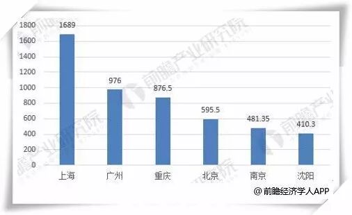 2017年上海、广州、重庆、北京等地展览面积(单位:万平方米)