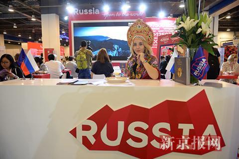 身穿俄罗斯传统服装的美女在俄罗斯展台为顾客提供咨询服务。