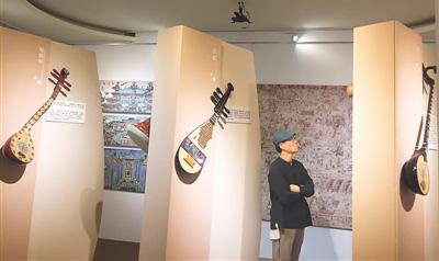 图为观众在参观欣赏敦煌壁画和敦煌乐器的复制件。
