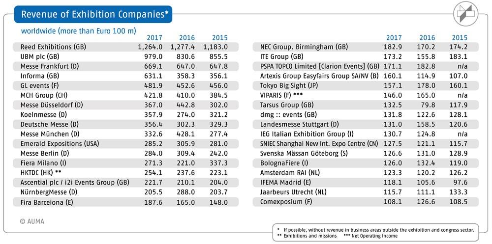 德国经济展览和博览会委员会(AUMA)于2017年8月18日发布了一份全球收入最高的展览公司研究报告。报告中AUMA以2017年展览公司的综合收入为基准进行调研结果为依据,出具了一份全球年综合收入超过1亿欧元展览公司榜单,其中综合收入包括主办收入、展馆运营收入和展会服务收入。