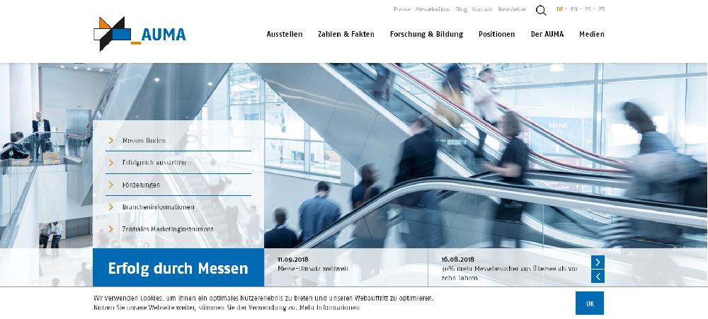 AUMA(Association of the German Trade Fair Industry),即德国经济展览和博览会委员会简称,在德国经济展览和博览会委员会在联邦经济与技术部和消费者?;ぁ⒂肱┮挡啃?,为德国官方参与国外展会计划做筹划准备工作的组织。在该筹划准备工作范围内,德国政府为德国企业去国外展会共同参展提供可观的经济支持,同时也为德国企业在国外自我介绍提供这种支持。该范围内的商业与政策的利益由一个负责国外参展特别小组来协调。侧重出口的经济团体的专家和部委的专家定期在小组举行会晤。德国经济展览和博览会委员会的会员是: 德国经济的优秀团体(工业、商业和手工业);对参展有兴趣的展商和采购商以及展会搭建公司; 德国展会组织人以及实施国外参展计划的企业。
