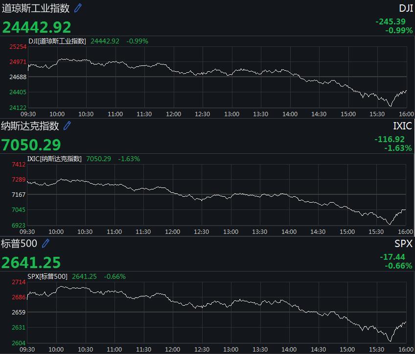 截至收盘,道琼斯工业平均指数收跌245.39点,跌幅0.99%,报24442.92点。纳斯达克综合指数收跌116.92点,跌幅1.63%,报7050.29点。标普500指数收跌17.61点,跌幅0.66%,报2641.26点。