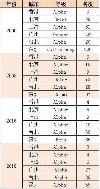 相比2016年,广州排名再次上升,位列第27位,在该名册中首次进入Alpha级别。位于该级别的中国城市还有台北。值得关注的是,深圳在2018年的名册中,首次进入Alpha-级别,与2016年相比,直接上升了两个级别。