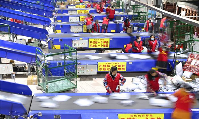 中国邮政集团公司湖南省分公司衡阳邮区中心局分拣中心的工作人员在作业。 曹正平摄 (新华社发)