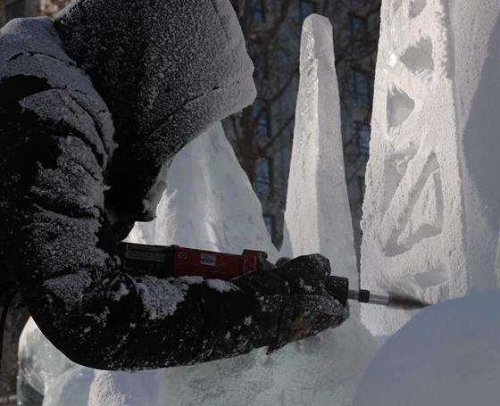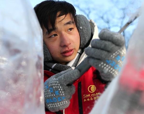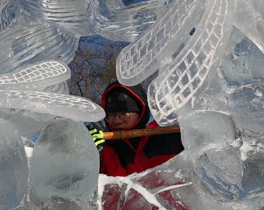 12月27日,选手在比赛中完善冰雕作品。 当日,第十六届黑龙江省大学生冰雕艺术设计创作大赛在哈尔滨兆麟公园落下帷幕,全省高校共有99支队伍参赛。 新华社记者曹霁阳摄