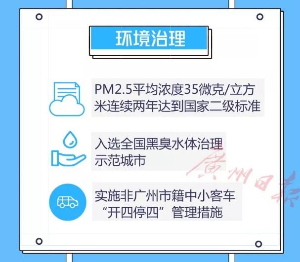 创建600个生活垃圾分类样板小区 (社区); 在越秀区、海珠区、荔湾区、天河区、黄埔区和番禺区6个区整区,其余5区共22条街道整街开展强制分类;实施治水三年行动计划,到2019年完成147条黑臭河涌整治任务。