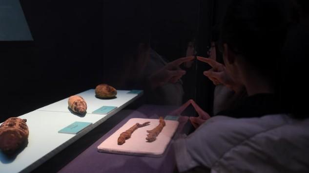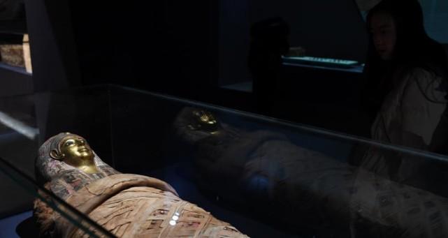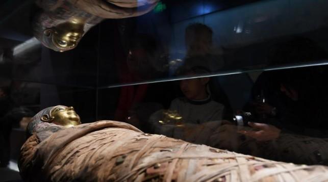 1月22日,《法老的国度——古埃及文明展》在浙江省博物馆开展,来自意大利多家博物馆的180件古埃及文物集中亮相。图为参观者观看木乃伊。中新社记者 王刚 摄